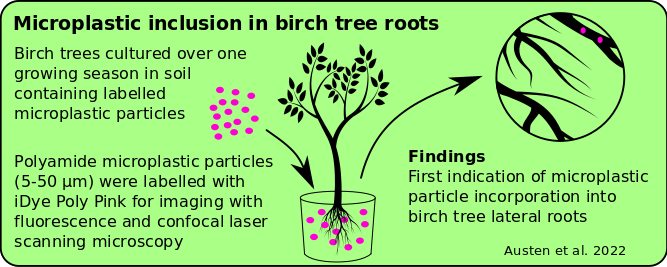 Here, we report findings from a study on the potential for uptake and incorporation of primary microplastic beads into the root tissue of the pioneer species, Betula pendula Roth., commonly known as silver birch. Birch trees have been used to remediate contaminated land (Jonczak et al., 2020 ) by sequestering and storing industrial pollutants in their tissues, which subsequently allows the colonisation of microbial communities that breakdown polyaromatic hydrocarbons (Sipilä et al., 2008) and heavy metals (Rosselli et al., 2003). Common across temperate Eurasian and North American landscapes, birch trees rapidly colonize and stabilise disturbed land allowing for reforestation (Jonczak et al.,2020 ). Because the species' dense root system lies near the soil surface (Mauer and Palátová, 2012) where the concentration of microplastic pollution has been shown to be highest (Liu et al., 2018), the motivation for this study was, can birch trees offer phytoremediation of plastic-pervaded soils by the direct uptake of microplastic particles?