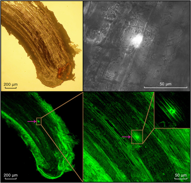 Fig. 1. Longitudinal cross-section showing microplastic particles inside a birch lateral root in a one-year-old birch tree after being exposed to contaminated soil for 5 months. Clockwise from top left shows cross sections using light microscopy, fluorescence microscopy, and confocal laser scanning microscopy. Arrows point to fluorescing microplastic particles. Inset in bottom right panel shows the area indicated by the arrows in the bottom left panel after enlargement. All images have been enhanced using a contrast and brightness correction. Scales are shown in the bottom right or left corner of the respective image.