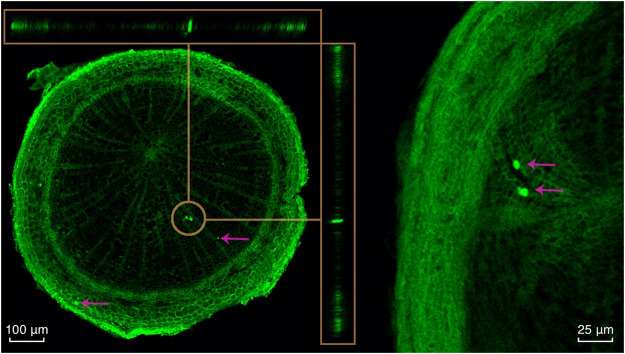 Fig. 2. Confocal laser scanning micrographs of two birch root cross sections showing the incorporation of microplastic particles in a one-year-old tree after being exposed to contaminated soil for 5 months. The location of microplastic particles are indicted by arrows and highlighted inside the circle. In the left image, the upper and right panels show the orthogonal view of the z-stacks, showing the presence of the fluorescing microplastic particle within the sample slice. The location of microplastic particles is indicated by arrows, circle, and guidelines from the circle to each z-stack. All images have been enhanced using a contrast and brightness correction. Scale is shown in the bottom right or left corner of the respsective image.